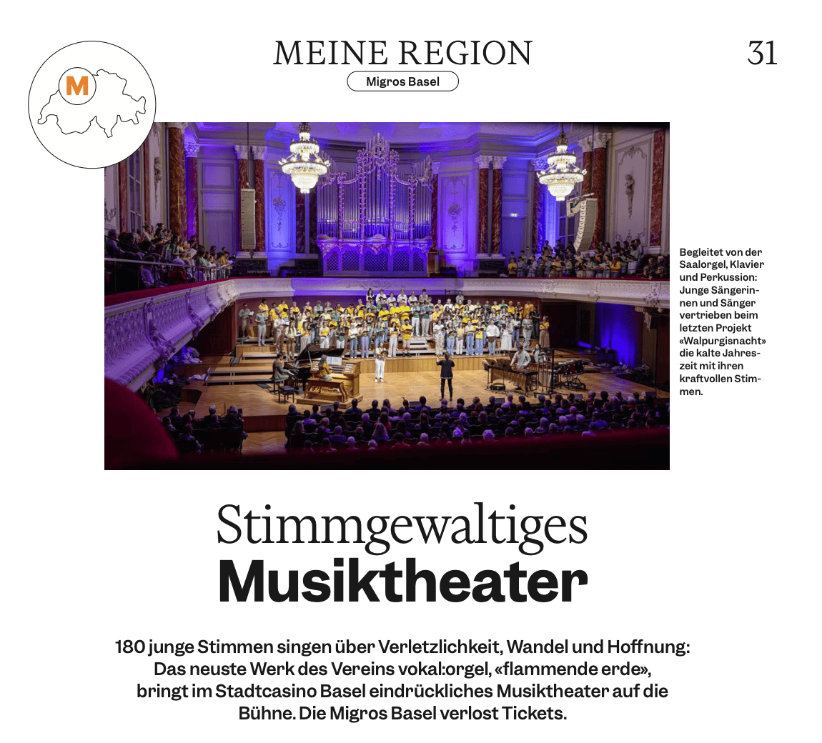 «Es war ein gewagtes Experiment, und es ist gelungen: Mit Jugendchören aus Basel und dem Basler Umland brachte der Verein „vokal:orgel“ die Kantate „Die erste Walpurgisnacht“ von Felix Mendelssohn-Bartholdy auf die Bühne des Stadtcasinos.»