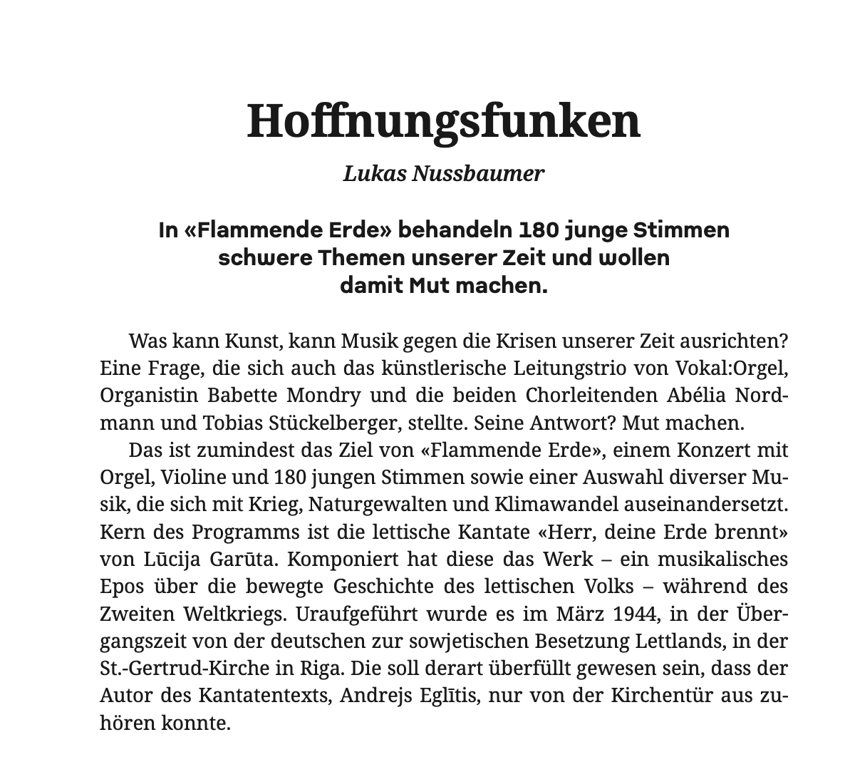 «Das Publikum, welches den grossen Saal bis fast zum letzten Platz füllte und in dem sich erfreulicherweise viele junge und jüngere Gesichter ausmachen liessen, würdigte dieses aussergewöhnliche und farbige Projekt mit riesigem Applaus und grosser Begeisterung.»